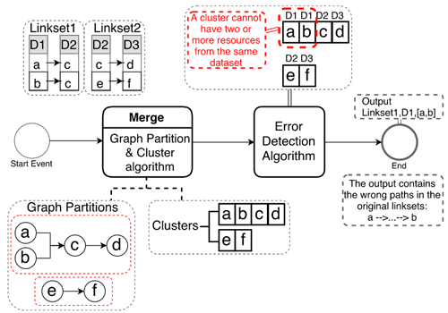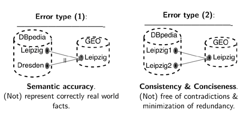 A typical scenario using CEDAL is as follows: suppose that we have two datasets (D1 and D2) about geographic regions, and a linkset (L1) relating those data. As expected, L1 contains a link between equal resources such as D1:Leipzig and D2:Leipzig. However, within L1, we also find a link stating that D1:Dresden is the same as D2:Leipzig, whereas Leipzig and Dresden are two different cities in Germany. By virtue of transitivity, this error can happen in several linksets. Errors in these links can lead to applications failing completely and CEDAL is able to detect this kind of error.
